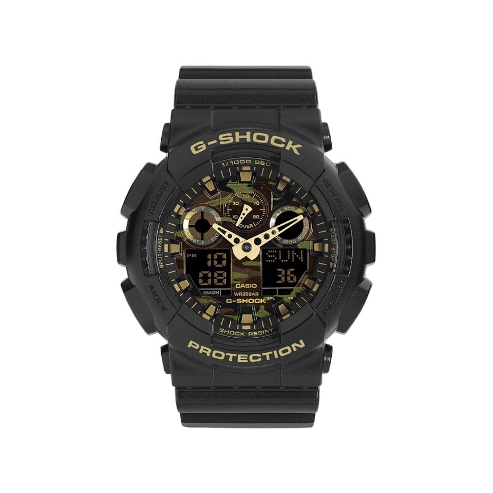 Introducing a collection of new G-SHOCK models whose 35mm diameter faces and large cases give them a look of power and strength. Dial rings and raised hour markers also create three-dimensional depth that gives the face plenty of character. These watches are designed and engineered to deliver outstanding shock resistance, are 200m water resistant, and anti-magnetic. The GA-100CF-1A9ER is beautifully finished in black with a khaki design on the face, reverse LCD display, gold coloured accents, and a black strap for a distinctive look. Over-sized buttons come with a checkered anti-slip surface to make operations fast and sure. 1/1000-second stopwatch, velocity indicator, World Time, 5 alarms and much more provides these models with unmatched function and performance.
