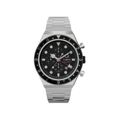 Timex 3 Time Zone Chronograph is equipped with an hour hand and red second hour hand which can be set independently to track 2 different time zones, a rotating top ring which can accommodate a 3rd time zone using either of the hour hands, and a standard chronograph function. The watch takes inspiration from the design aesthetics of Timex original dive-inspired Q, but with added sleek updates breathes new life into ithe familiar 40mm case profile. The watch features a modernised Timex logo, flat mineral glass crystal with beveled edge, stainless-steel crown with rubber accent, and a 24-hour format sub-dial at the 12 o’clock position.Â